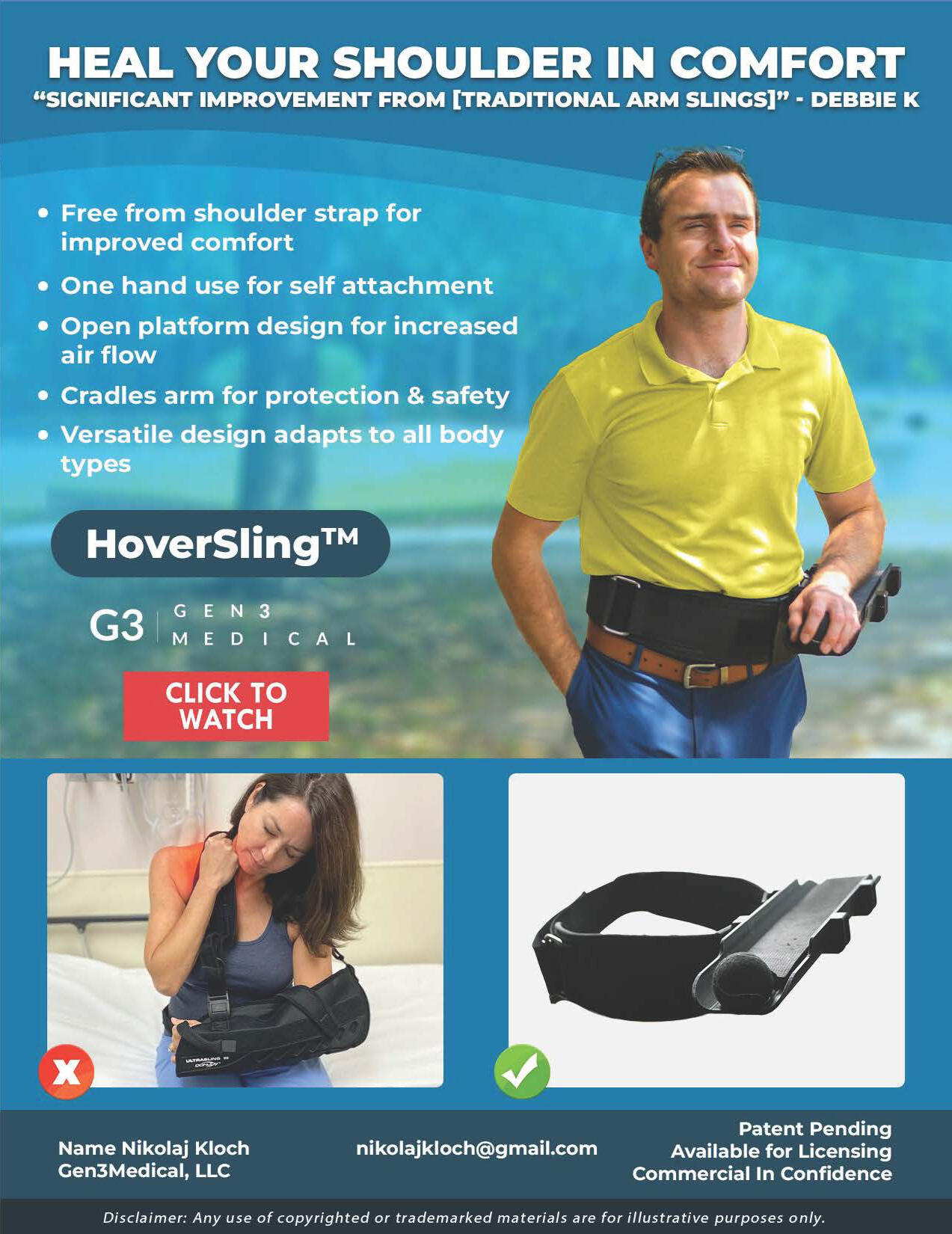 Born from direct collaboration with an orthopedic surgeon and physical therapist with 66+ years of combined clinical experience, the Hover Sling™ was developed to solve real patient challenges in post-operative shoulder support and rehabilitation.Over 25+ design iterations and 100+ custom sling fabrications, we refined function, comfort, adjustability, and real-world usability—validated through clinical testing with 30+ patients. The result was a patented, clinically proven product that was acquired for commercialization.Disciplined engineering. Clinical input. Real-world validation.